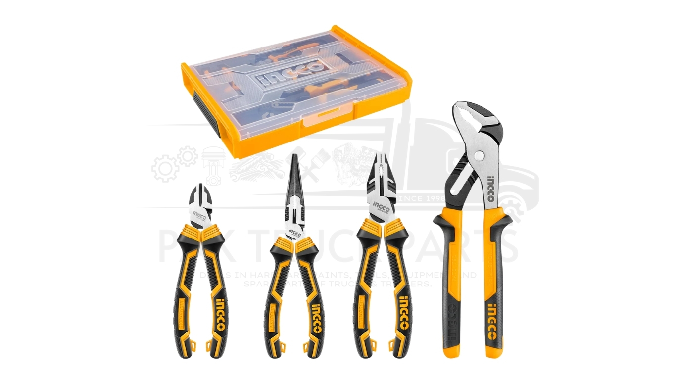 The INGCO 4 Pcs Pliers Set (often model HKTV01P041 or HKTV01P042) is a versatile industrial-grade tool kit, usually featuring Chrome-Vanadium (Cr-V) steel construction with a polished, anti-rust finish. They feature ergonomic, two-tone TPR handles for grip and high-leverage designs, typically providing 30% more power than standard pliers.