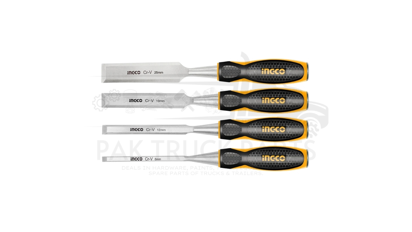 The INGCO 4 Pcs Wood Chisel Set is a professional woodworking set featuring 140mm long, Cr-V (Chrome Vanadium) steel blades with widths of 6mm, 12mm, 19mm, and 25mm. Designed for durability, these heat-treated chisels have beveled edges, ergonomic soft-grip handles, and steel strike caps for hammering.