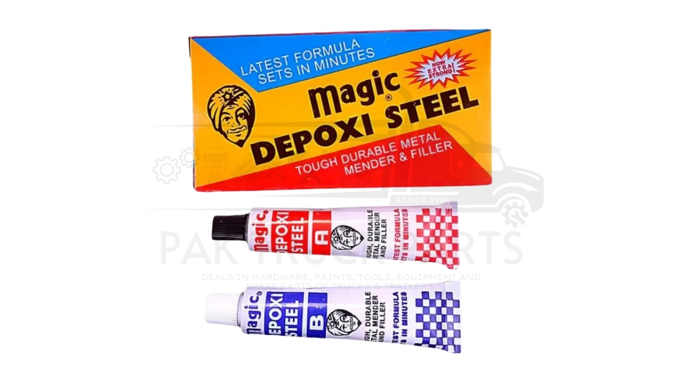 Magic Depoxi Steel is a fast-setting, two-part epoxy resin and hardener adhesive designed to bond, fill, and repair metal, ceramic, wood, and plastic. It cures in 4–20 minutes to a rigid, metallic-like finish, capable of withstanding extreme pressure (4000 + PSI) and temperature upto