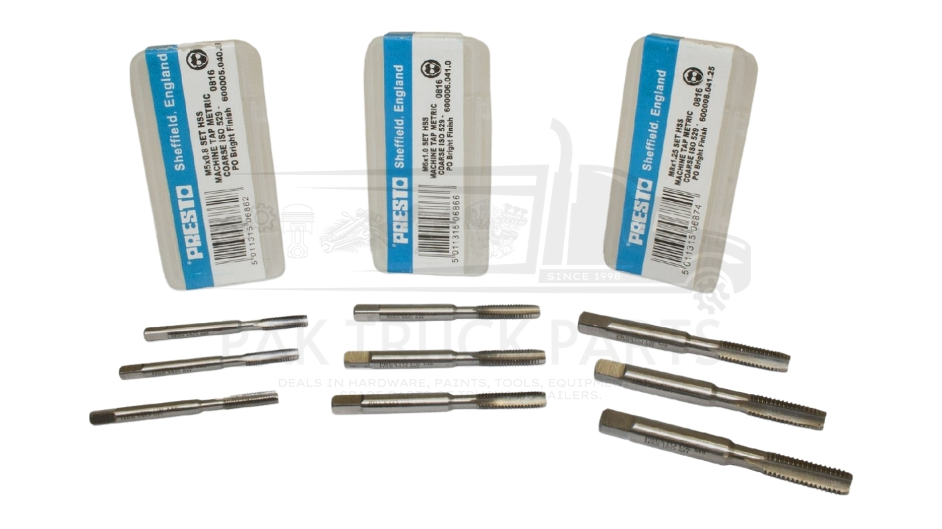 Presto Hand Taps are professional-grade, high-speed steel (HSS) tools designed for creating precise internal threads in steel and non-ferrous materials. Available in metric coarse and fine sizes, these durable, often bright-finished, straight-flute taps come in sets of three (roughing, intermediate, and finishing) for manual or machine threading.