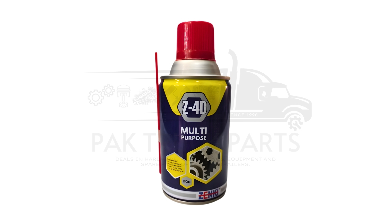 Z-4D Multi-Purpose Lubricant Spray is a versatile, 4-in-1 maintenance aerosol designed to lubricate moving parts, remove rust, displace moisture, and clean surfaces. It is commonly used for loosening seized nuts/bolts, quieting squeaks, protecting against corrosion, and cleaning dirt or grease from machinery, tools, and automotive parts.